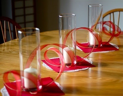 Simple and elegant, in this centerpiece we have some glass vases with candles inside and red ribbons between them.